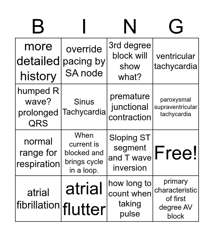 This bingo card has a free space and 19 words: primary characteristic of first degree AV block, In 2nd degree AV block which block has a concern, 3rd degree block will show what?, conduction block that represents RSR wave form, Free!, humped R wave? prolonged QRS, how long to count when taking pulse, more detailed history, override pacing by SA node, normal range for respiration, When current is blocked and brings cycle in a loop., Sinus Tachycardia, premature junctional contraction, atrial flutter, atrial fibrillation, bigeminy, ventricular tachycardia, paroxysmal supraventricular tachycardia and right axis deviation.