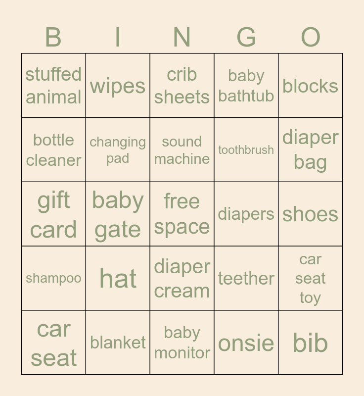 This bingo card has a free space and 44 words: stroller, bib, baby lotion, car seat, bath toy, onsie, crib sheets, socks, blocks, blanket, baby bathtub, diapers, diaper cream, hat, wash cloths, baby monitor, night lights, gift card, pacifier, diaper bag, wipes, high chair, swing, stuffed animal, bottle, shoes, bath towel, baby powder, teether, shampoo, photo album, car seat toy, nursing pillow, thermometer, baby gate, dishes or utensils, hair brush, baby food, sound machine, bottle cleaner, toothbrush, pack and play, changing pad and baby carrier.