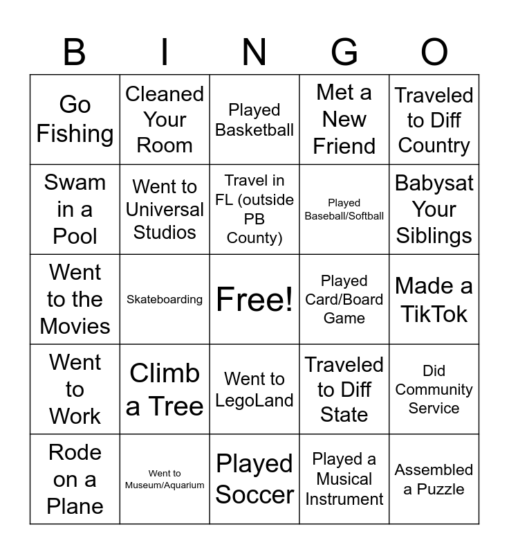 This bingo card has a free space and 48 words: Slept in Past Noon, Assembled a Puzzle, Learned a New Dance, Played Soccer, Climb a Tree, Binge Watched Show(s), Cleaned Your Room, Rode a Bike, Swam in a Pool, Went to Disney World, Went to Universal Studios, Met a New Friend, Did Community Service, Traveled to Diff State, Draw, Had a Birthday, Travel in FL (outside PB County), Played Card/Board Game, Went to the Beach, Traveled to Diff Country, Skateboarding, Played a Musical Instrument, Go Fishing, Played Baseball/Softball, Rode on a Train, Babysat Your Siblings, Rode on a Plane, Went to Summer Camp, Went to LegoLand, Went to Work, Took a Road Trip, Cook, Went to a Park, Slept at a Friend's House, Went to Museum/Aquarium, Ate McDonald's, Read a Book, Made a TikTok, Went on a Boat, Told Parents You Love Them, Play Football, Ate WingStop, Played Basketball, Paint, Went to the Movies, Attended a Party, Go to the Rapids and Got Your Nails Done.