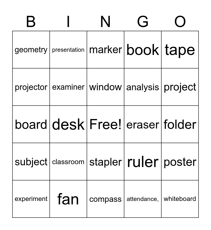 This bingo card has a free space and 60 words: assignment, fan, light, subject, attendance,, notebook, examiner, map, analysis, cabinet, book, clock, projector, bulletin, door, geometry, whiteboard, tape, tripod, window, eraser, marker, experiment, poster, worksheet, microscope, bin, sharpener, project, printer, curriculum, pencil, teacher, computer, presentation, student, paper, desk, syllabus, board, glue, classroom, folder, protractor, ruler, dictionary, evaluation,, pen, stationery, stapler, compass, algebra, chair, homework, schedule, bag, highlighter, calendar, literature and recess.