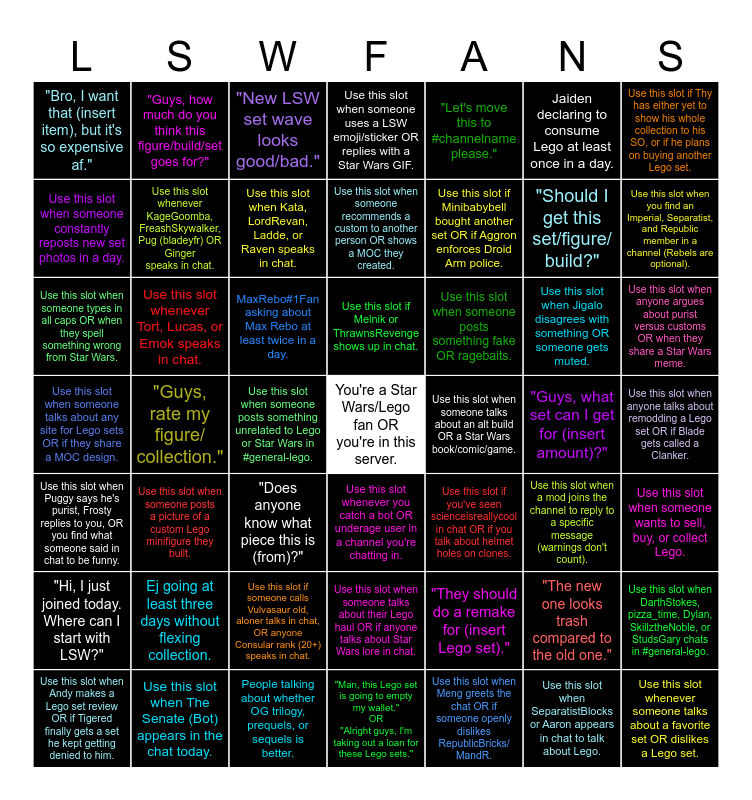 This bingo card has a free space and 48 words: Use this slot when Puggy says he's purist, Frosty replies to you, OR you find what someone said in chat to be funny., "Guys, rate my figure/ collection.", People talking about whether OG trilogy, prequels, or sequels is better., Use this slot whenever you catch a bot OR underage user in a channel you're chatting in., Use this slot if Minibabybell bought another set OR if Aggron enforces Droid Arm police., "Guys, what set can I get for (insert amount)?", Use this slot if Thy has either yet to show his whole collection to his SO, or if he plans on buying another Lego set., Use this slot when Andy makes a Lego set review OR if Tigered finally gets a set he kept getting denied to him., Use this slot whenever Tort, Lucas, or Emok speaks in chat., Use this slot when someone posts something unrelated to Lego or Star Wars in #general-lego., Use this slot when someone uses a LSW emoji/sticker OR replies with a Star Wars GIF., "Let's move this to #channelname please.", Use this slot when Jigalo disagrees with something OR someone gets muted., Use this slot when anyone argues about purist versus customs OR when they share a Star Wars meme., Use this slot when someone talks about any site for Lego sets OR if they share a MOC design., Ej going at least three days without flexing collection., "New LSW set wave looks good/bad.", Use this slot if Melnik or ThrawnsRevenge shows up in chat., "They should do a remake for (insert Lego set).", Jaiden declaring to consume Lego at least once in a day., Use this slot when you find an Imperial, Separatist, and Republic member in a channel (Rebels are optional)., Use this slot when someone constantly reposts new set photos in a day., "Guys, how much do you think this figure/build/set goes for?", Use this slot when Kata, LordRevan, Ladde, or Raven speaks in chat., Use this slot when Meng greets the chat OR if someone openly dislikes RepublicBricks/ MandR., "Should I get this set/figure/ build?", Use this slot when anyone talks about remodding a Lego set OR if Blade gets called a Clanker., "Hi, I just joined today. Where can I start with LSW?", Use this slot when someone posts a picture of a custom Lego minifigure they built., MaxRebo#1Fan asking about Max Rebo at least twice in a day., Use this slot when someone talks about their Lego haul OR if anyone talks about Star Wars lore in chat., Use this slot when someone posts something fake OR ragebaits., "The new one looks trash compared to the old one.", Use this slot when DarthStokes, pizza_time, Dylan, SkillztheNoble, or StudsGary chats in #general-lego., "Bro, I want that (insert item), but it's so expensive af.", Use this slot when The Senate (Bot) appears in the chat today., "Does anyone know what piece this is (from)?", "Man, this Lego set is going to empty my wallet." OR "Alright guys, I'm taking out a loan for these Lego sets.", Use this slot when someone talks about an alt build OR a Star Wars book/comic/game., Use this slot when SeparatistBlocks or Aaron appears in chat to talk about Lego., Use this slot when someone wants to sell, buy, or collect Lego., Use this slot when someone types in all caps OR when they spell something wrong from Star Wars., Use this slot whenever KageGoomba, FreashSkywalker, Pug (bladeyfr) OR Ginger speaks in chat., Use this slot if someone calls Vulvasaur old, aloner talks in chat, OR anyone Consular rank (20+) speaks in chat., Use this slot when someone recommends a custom to another person OR shows a MOC they created., Use this slot if you've seen scienceisreallycool in chat OR if you talk about helmet holes on clones., Use this slot when a mod joins the channel to reply to a specific message (warnings don't count). and Use this slot whenever someone talks about a favorite set OR dislikes a Lego set..