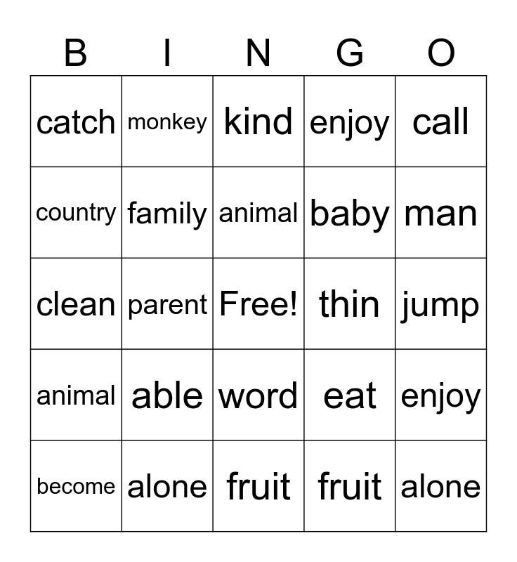 This bingo card has a free space and 24 words: able, alone, animal, become, call, catch, country, monkey, thin, word, baby, clean, eat, enjoy, family, fruit, jump, kind, man, parent, alone, animal, enjoy and fruit.