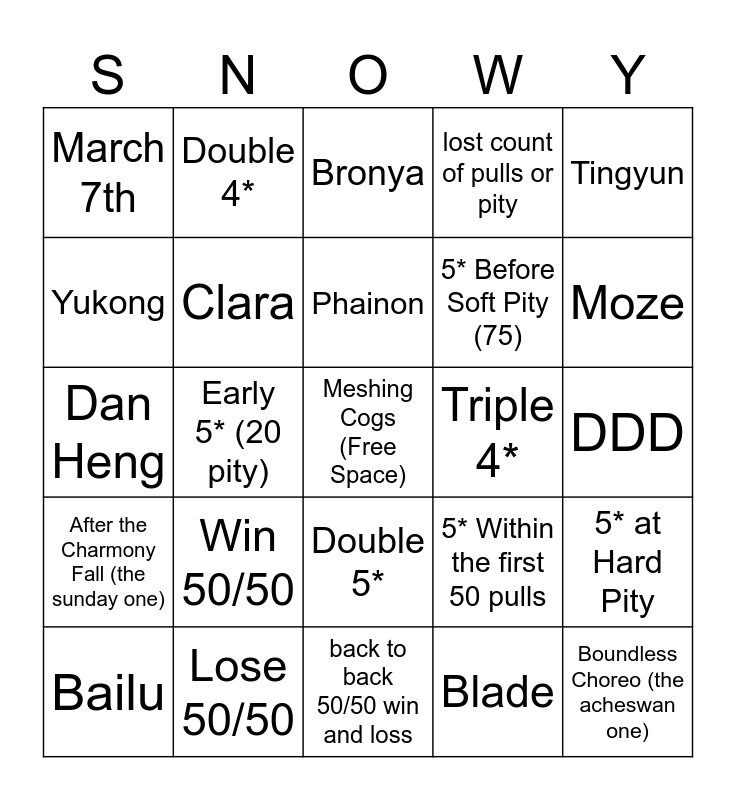 This bingo card has a free space and 24 words: Win 50/50, Lose 50/50, Phainon, Bailu, Tingyun, March 7th, Yukong, Double 4*, Triple 4*, Double 5*, 5* Before Soft Pity (75), Dan Heng, 5* Within the first 50 pulls, 5* at Hard Pity, Clara, Blade, DDD, Bronya, Moze, Early 5* (20 pity), Boundless Choreo (the acheswan one), After the Charmony Fall (the sunday one), lost count of pulls or pity and back to back 50/50 win and loss.