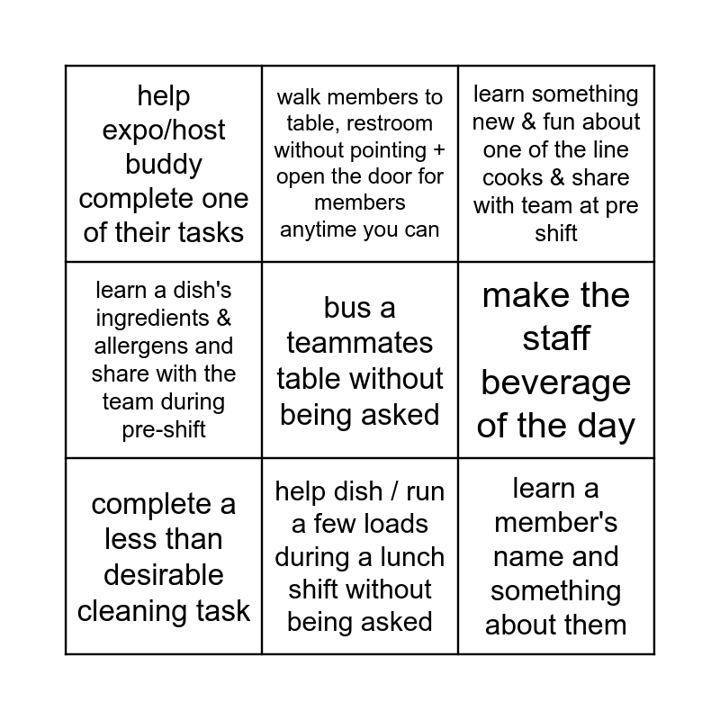 This bingo card has a free space and 8 words: make the staff beverage of the day, learn something new & fun about one of the line cooks & share with team at pre shift, walk members to table, restroom without pointing + open the door for members anytime you can, complete a less than desirable cleaning task, help expo/host buddy complete one of their tasks, learn a member's name and something about them, learn a dish's ingredients & allergens and share with the team during pre-shift and help dish / run a few loads during a lunch shift without being asked.
