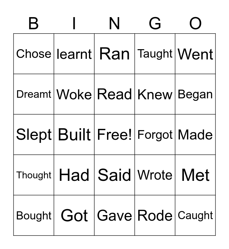 This bingo card has a free space and 25 words: Had, Gave, Read, Bought, Went, Chose, Dreamt, learnt, Forgot, Said, Knew, Slept, Wrote, Met, Woke, Took, Made, Ran, Began, Built, Caught, Got, Thought, Taught and Rode.