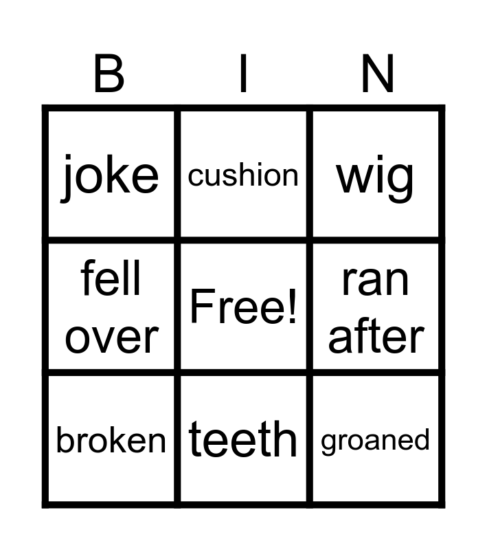 This bingo card has a free space and 15 words: princess, make one laugh, wig, joke, teeth, groaned, dropped, ran off, ran after, this way, grabbed, fell over, broken, cushion and what a pity.