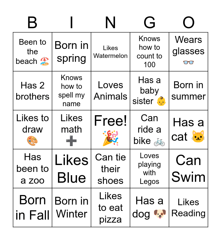 This bingo card has a free space and 24 words: Likes Blue, Born in Winter, Loves Animals, Born in Fall, Wears glasses 👓, Been to the beach 🏖️, Has 2 brothers, Born in spring, Can ride a bike 🚲, Can tie their shoes, Has a baby sister 👶, Likes to draw 🎨, Loves playing with Legos, Can Swim, Knows how to spell my name, Has a dog 🐶, Has a cat 🐱, Likes Watermelon, Born in summer, Likes math ➕, Likes Reading, Has been to a zoo, Knows how to count to 100 and Likes to eat pizza.