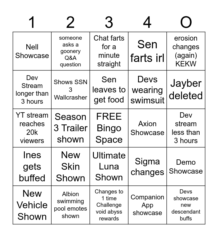 This bingo card has a free space and 24 words: New Skin Shown, Albion swimming pool emotes shown, Sen leaves to get food, New Vehicle Shown, erosion changes (again) KEKW, Nell Showcase, Dev Stream longer than 3 hours, someone asks a goonery Q&A question, Axion Showcase, Ultimate Luna Shown, Devs wearing swimsuit, YT stream reaches 20k viewers, Sigma changes, Demo Showcase, Shows SSN 3 Wallcrasher, Companion App showcase, Dev stream less than 3 hours, Chat farts for a minute straight, Jayber deleted, Season 3 Trailer shown, Devs showcase new descendant buffs, Ines gets buffed, Sen farts irl and Changes to 1 time Challenge void abyss rewards.