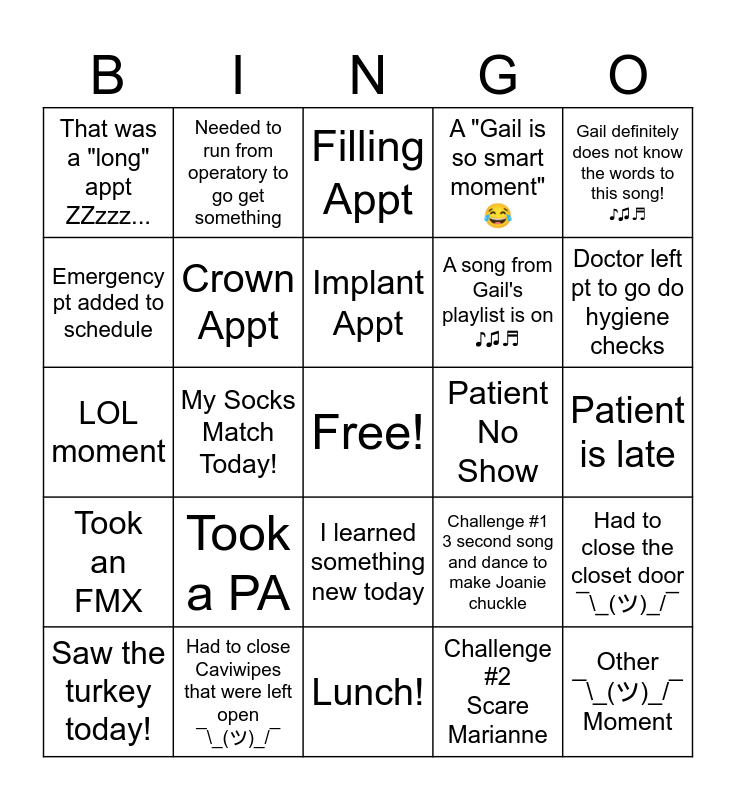 This bingo card has a free space and 24 words: Took a PA, Had to close Caviwipes that were left open ¯\_(ツ)_/¯, Implant Appt, Saw the turkey today!, Gail definitely does not know the words to this song! ♪♫♬, That was a "long" appt ZZzzz..., Emergency pt added to schedule, Needed to run from operatory to go get something, Patient No Show, I learned something new today, A song from Gail's playlist is on ♪♫♬, LOL moment, Challenge #1 3 second song and dance to make Joanie chuckle, Had to close the closet door ¯\_(ツ)_/¯, Crown Appt, Challenge #2 Scare Marianne, Patient is late, Filling Appt, Doctor left pt to go do hygiene checks, My Socks Match Today!, Other ¯\_(ツ)_/¯ Moment, Took an FMX, A "Gail is so smart moment" 😂 and Lunch!.