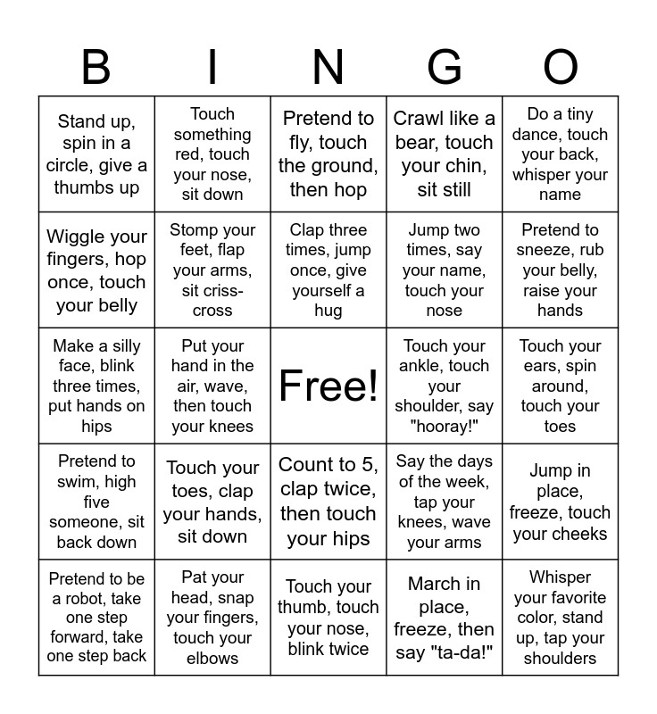 This bingo card has a free space and 24 words: Touch your toes, clap your hands, sit down, Pat your head, snap your fingers, touch your elbows, Clap three times, jump once, give yourself a hug, Pretend to be a robot, take one step forward, take one step back, Do a tiny dance, touch your back, whisper your name, Stand up, spin in a circle, give a thumbs up, Wiggle your fingers, hop once, touch your belly, Touch something red, touch your nose, sit down, Touch your ankle, touch your shoulder, say "hooray!", Count to 5, clap twice, then touch your hips, Jump two times, say your name, touch your nose, Make a silly face, blink three times, put hands on hips, Say the days of the week, tap your knees, wave your arms, Jump in place, freeze, touch your cheeks, Stomp your feet, flap your arms, sit criss-cross, March in place, freeze, then say "ta-da!", Touch your ears, spin around, touch your toes, Pretend to fly, touch the ground, then hop, Pretend to sneeze, rub your belly, raise your hands, Put your hand in the air, wave, then touch your knees, Whisper your favorite color, stand up, tap your shoulders, Pretend to swim, high five someone, sit back down, Crawl like a bear, touch your chin, sit still and Touch your thumb, touch your nose, blink twice.