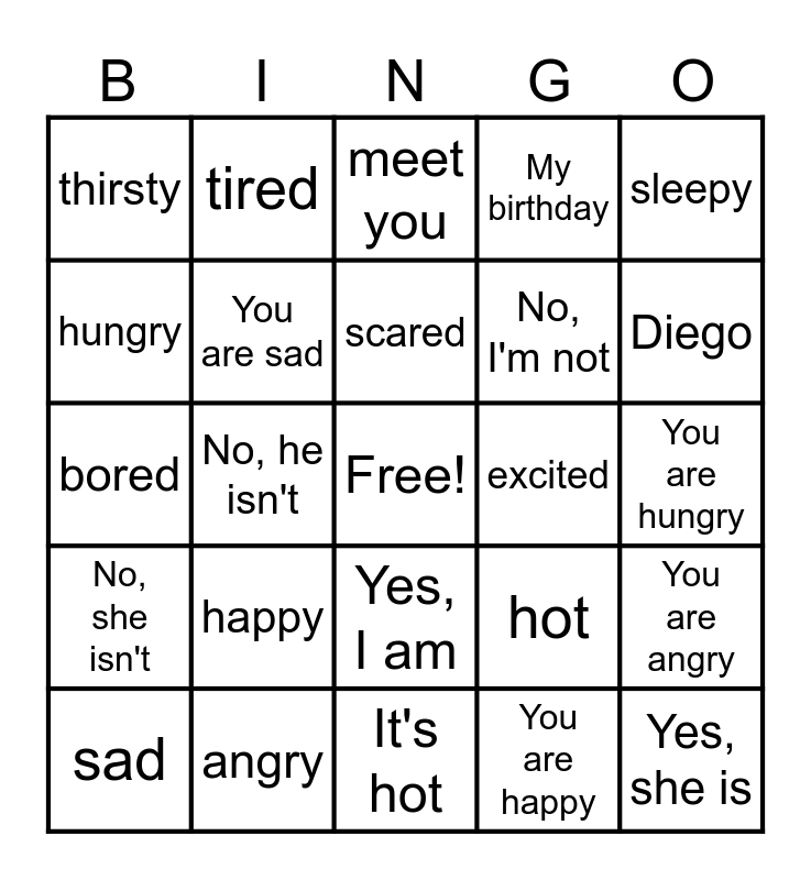 This bingo card has a free space and 24 words: happy, angry, scared, sad, sleepy, thirsty, hungry, tired, excited, Yes, I am, No, I'm not, bored, hot, You are angry, You are sad, You are happy, You are hungry, meet you, Diego, No, he isn't, Yes, she is, No, she isn't, My birthday and It's hot.