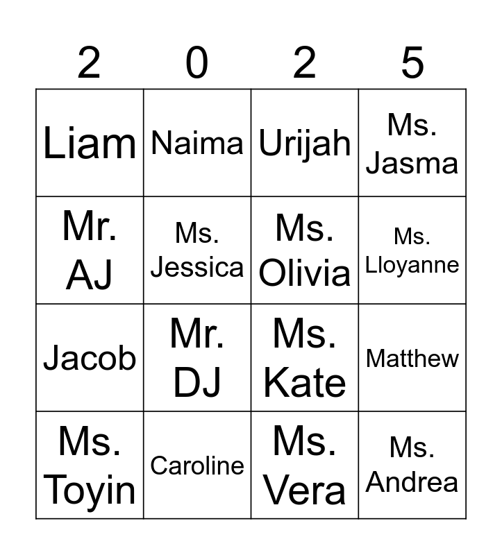 This bingo card has 16 words: Caroline, Matthew, Urijah, Liam, Jacob, Naima, Ms. Kate, Ms. Vera, Mr. AJ, Ms. Jessica, Ms. Toyin, Ms. Jasma, Mr. DJ, Ms. Lloyanne, Ms. Olivia and Ms. Andrea.