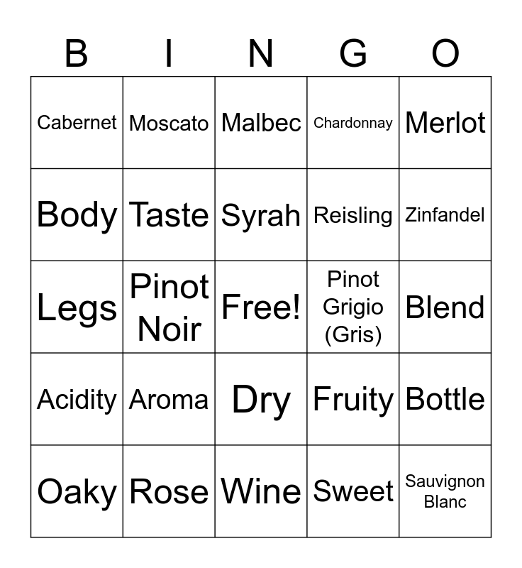 This bingo card has a free space and 24 words: Aroma, Rose, Syrah, Oaky, Merlot, Cabernet, Body, Moscato, Pinot Grigio (Gris), Dry, Reisling, Legs, Fruity, Bottle, Taste, Sweet, Blend, Malbec, Zinfandel, Pinot Noir, Sauvignon Blanc, Acidity, Chardonnay and Wine.