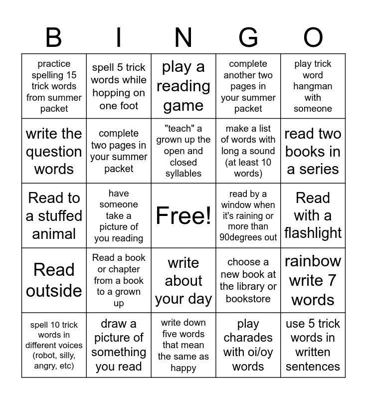This bingo card has a free space and 24 words: Read a book or chapter from a book to a grown up, draw a picture of something you read, "teach" a grown up the open and closed syllables, spell 10 trick words in different voices (robot, silly, angry, etc), play trick word hangman with someone, practice spelling 15 trick words from summer packet, write the question words, spell 5 trick words while hopping on one foot, read by a window when it's raining or more than 90degrees out, write about your day, make a list of words with long a sound (at least 10 words), Read to a stuffed animal, choose a new book at the library or bookstore, rainbow write 7 words, complete two pages in your summer packet, play charades with oi/oy words, Read with a flashlight, play a reading game, read two books in a series, have someone take a picture of you reading, use 5 trick words in written sentences, Read outside, complete another two pages in your summer packet and write down five words that mean the same as happy.