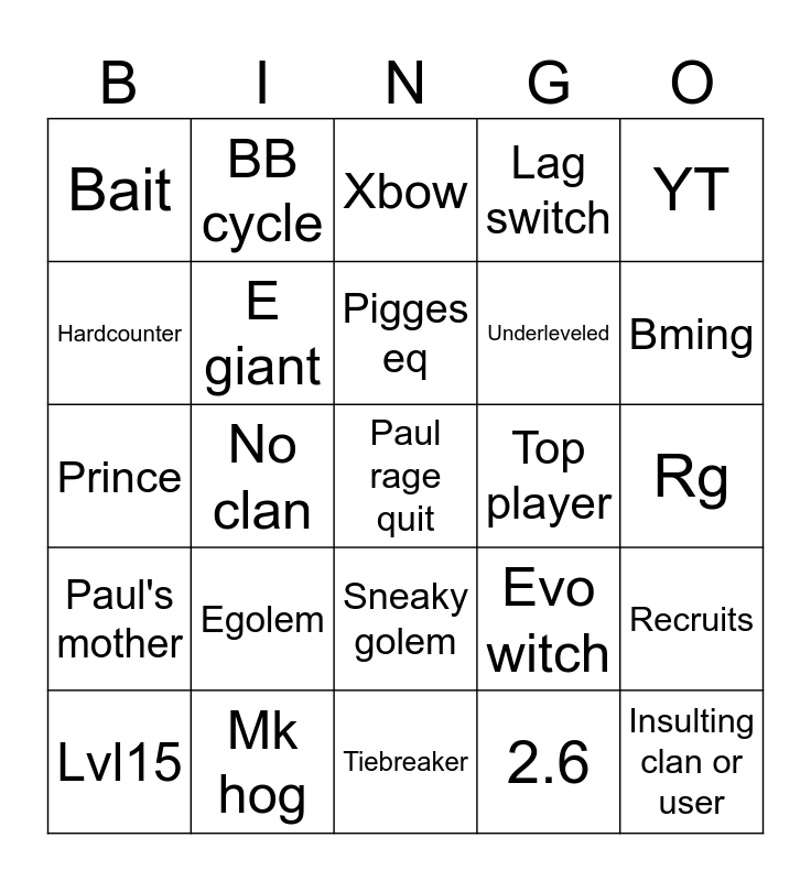 This bingo card has a free space and 24 words: Egolem, Mk hog, Pigges eq, Lvl15, YT, Bait, Hardcounter, BB cycle, Top player, Sneaky golem, Underleveled, Prince, Evo witch, Recruits, E giant, 2.6, Rg, Xbow, Bming, No clan, Insulting clan or user, Paul's mother, Lag switch and Tiebreaker.