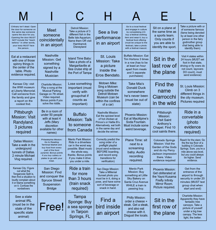 This bingo card has 50 words: Get from the entrance of the airport to through security in under 20 minutes (MUST text group chat when start and end), Sit in the last row of the plane, Sit in the first row of the plane, Be in a room of under 50 people with at least 4 Jeffs (Mary discretion available for other names), Lose something important (must verify with groupchat if counts as important), Correctly predict the song order of a preflight playlist (must send evidence BEFORE boarding, and record song transitions for verification), Meet someone coincidentally in an airport, Find a bird inside an airport, Sit on a plane at the same time as a sports team. Only counts if you are able to identify the sport., Plane Time: sit next to a screaming baby. Audio recording required., Take a picture with or of someone famous (fame being denoted by at least one other person in the fairy godmother group chat being able to identify them), See a live performance in an airport, Find the name Ciarrocchi in the wild, Take Mia’s Donald Duck somewhere he’s never been (must be out of state), Ride a train for more than 3 hours (train snack required), Ride in a convertable (photo evidence required), Eat at a restaurant with one of those spinny things in the center of the table. Photo evidence required., Visit 4 states within 24 hours (MUST set foot in that state, driving or fly overs do not count, layovers DO count), must send evidence), See a state animal IRL (must be in the state of the specific state animal), Go to a local festival and engage in culture by completeing 2/3: buy a festival clothing item and wear it, buy a festival food offering (must be unique to the festival), take a photo with a festival mascot., Buffalo Mission: Eat Tim Hortons 3 times in a row (has to be at least an hour apart from meals and 3 separate purchases), Buffalo Mission: Talk to someone from Canada, Chilvary isn’t dead: Open the door for someone on the same day someone opens the door for you. Opening the door MUST NOT include the “reach behind.” In other words, your body MUST face the person., Nashville Mission: Get something signed by a Nashville Musician, Free!, Nashville Mission: Eat the spiciest level of hot chicken at Prince’s or Hattie B’s. Alternatively, eat both in the same day and decide the winner., Island Time Baby: Take a photo of a Margaritaville at Sea cruise ship at the Port of Tampa, Tampa Sponge: Buy a sea sponge in Tarpon Springs, FL, Detroit Mission: Take a picture of 3 different fish in the Belle Isle Aquarium. Name them OR visit Hamtramck Disneyland, Motown Mike: Sing a Motown song outside the Detroit Motown Museum (can be within the confines of a car), Dallas Mission: Take a picture of you spitting on the cowboys Stadium, Dallas Mission: Take a walk in the undergound tunnels of Dallas. 2 minute Michael Vlog required., San Diego Mission: Find and conquer the Spruce Street Suspension Bridge, San Diego Mission: Take a Millenial Sunset photo you must be in it, doing a pose, and have some sort of beverage or snack in hand., Pittsburgh Mission: Visit Randyland. 3 pictures required, Pittsburgh Mission: Visit Saint Anthony’s Chapel. Find 10 cool saints there., Colorado Springs Mission: Visit the Garden of the Gods and do my Percy Jackson impression there. Video evidence required, Reach for the stars: Go the the top floor of a building in Colorado Springs. Sure, you’re a mile above sea level, but you could always be higher. Send evidence., Kansas City: Figure out what the Tonganoxie Split is, then find a situation to loudly complain about it or blame something on it. Confuse the nonbelivers, Kansas City: visit the WWI museum at Liberty Memorial. Call someone from the family and give a report on the coolest find., Menlo Park Mission: Ride in a driverless car in the worst way possible. Blast music the whole way, thanks. Bonus points if you make it drive you under a mile., Menlo Park Mission: Buy something at Little Sky Bakery on Santa Cruz Avenue WHILE a train is passing buy., Philadelphia Mission: Go to Reading Terminal Market and buy food from every part of the food pyramid. Bonus points if you buy cutlery or plates to go with your meal., Philly Mission: order a cheese + steak. Get a steak, and also eat cheese with it. Disgust the locals., St. Louis Mission: Climb on 3 different things in the city museum. Pictures required, St. Louis Mission: Take a picture inside the Eros Bendato., Phoenix Mission: Eat at MacAlpine’s Soda Fountain. Must include some weird beverage., Phoenix Mission: Get obliterated at the Yayoi Kusama Firefly Infinity Mirror Room. Picture required., Charlotte Mission: Play a song at the Musical Parking Garage on 7th street. Video required. Bonus points if you solve the riddle. and Charlotte Mission: Apparently they have fantastic tree canopys. Take a picture of youself under a big tree canopy. The less light, the better..
