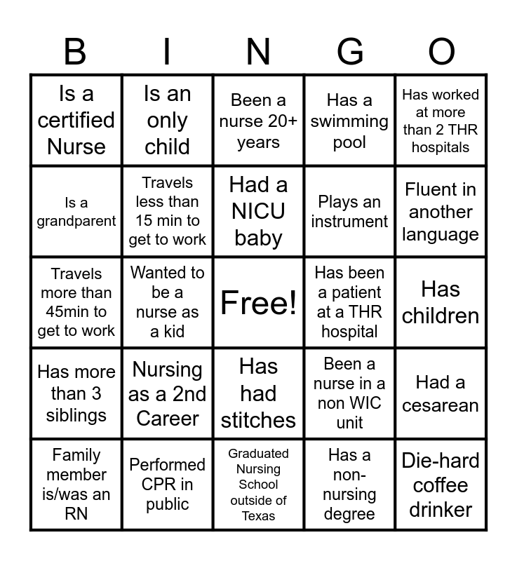 This bingo card has a free space and 29 words: Family member is/was an RN, Working on an Advanced Degree, Wanted to be a nurse as a kid, Been a nurse 10+ years, Is a certified Nurse, Been a nurse 20+ years, Travels less than 15 min to get to work, Nursing as a 2nd Career, Has been a patient at a THR hospital, Performed CPR in public, Has children, Die-hard coffee drinker, Graduated Nursing School outside of Texas, Has a non-nursing degree, Fluent in another language, Left Handed, Has had stitches, Has more than 3 siblings, Has worked at more than 2 THR hospitals, Travels more than 45min to get to work, Been a nurse in a non WIC unit, Has broken a bone, Plays an instrument, Is a grandparent, Has a swimming pool, Is an only child, Had a cesarean, Had a NICU baby and Has a birthday in July.