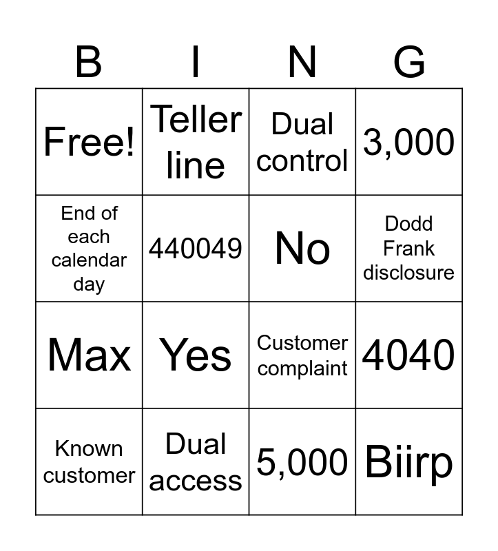 This bingo card has 16 words: Known customer, Dual access, Dual control, 3,000, End of each calendar day, Teller line, Customer complaint, 4040, Free!, 440049, 5,000, Dodd Frank disclosure, Max, Yes, No and Biirp.