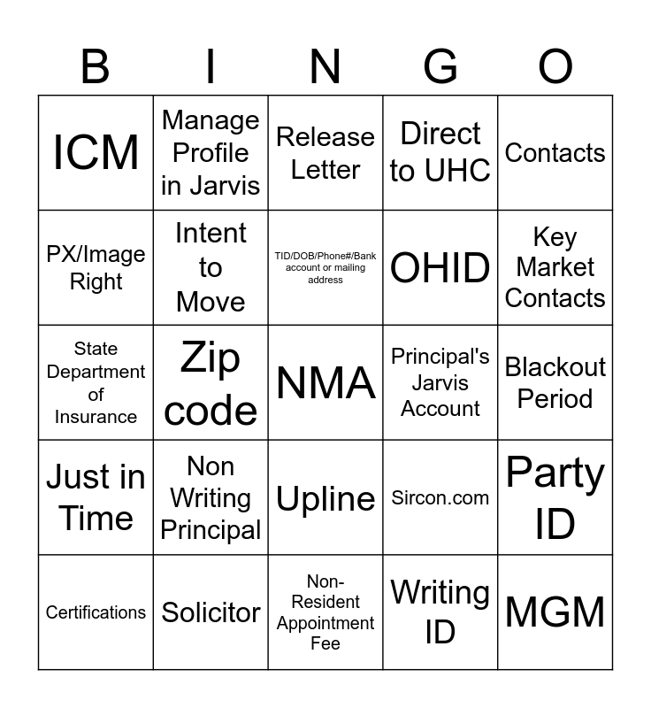 This bingo card has 25 words: Non Writing Principal, Non-Resident Appointment Fee, TID/DOB/Phone#/Bank account or mailing address, Certifications, Contacts, ICM, PX/Image Right, Manage Profile in Jarvis, Principal's Jarvis Account, Upline, OHID, State Department of Insurance, Sircon.com, Party ID, Intent to Move, MGM, Blackout Period, Release Letter, Key Market Contacts, Zip code, NMA, Solicitor, Just in Time, Direct to UHC and Writing ID.