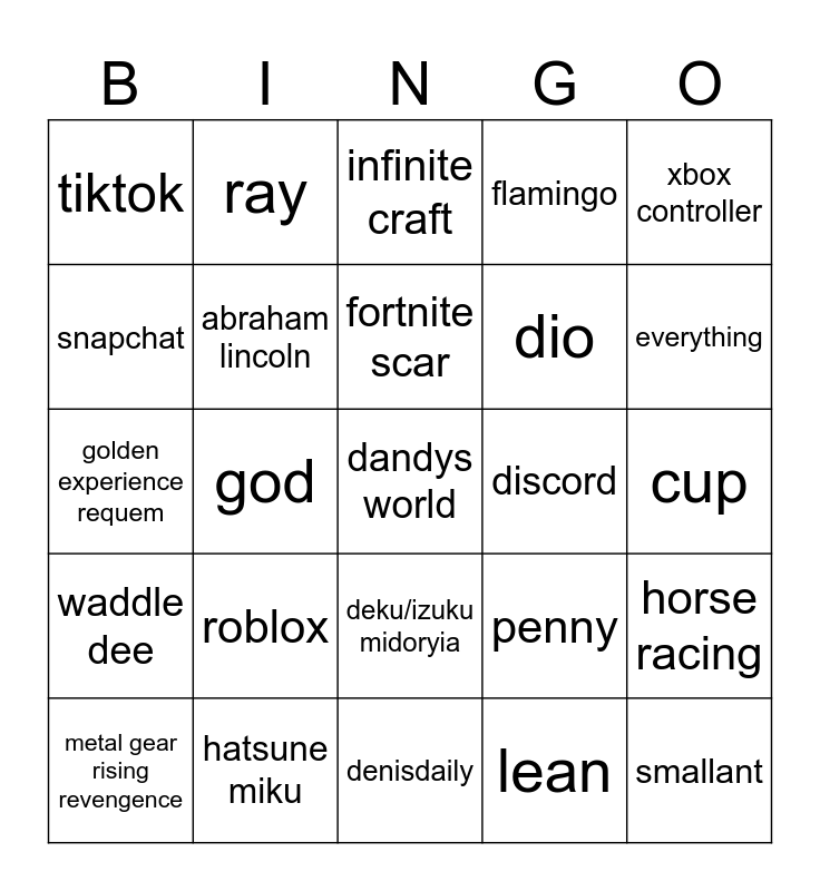 This bingo card has a free space and 24 words: roblox, hatsune miku, fortnite scar, metal gear rising revengence, xbox controller, tiktok, snapchat, ray, discord, deku/izuku midoryia, dio, golden experience requem, penny, horse racing, abraham lincoln, lean, cup, infinite craft, everything, god, smallant, waddle dee, flamingo and denisdaily.