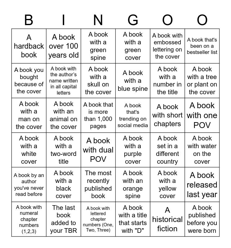 This bingo card has 110 words: Free!, A book with a colourful cover, A book with an animal on the cover, A book with food on the cover, A book with real people on the cover, A book with gold lettering on the cover, A book with a title that starts with "A", A book with a title that starts with "B", A book with a title that starts with "C", A book with a title that starts with "D", A book with a title that starts with "E", A book with a title that starts with "M", A book with a title that starts with "P", A book with a title that starts with "R", A book with a title that starts with "S", A book with a title that starts with "T", A book with a number in the title, A book with a title longer than five words, A book with a title that starts with "The", A book with a one-word title, A book with a two-word title, A book with a three-word title, A book with a four-word title, A book with a five-word title, A book with a title written in all capital letters, A book with the author’s name written in all capital letters, A book with embossed lettering on the cover, A book with a black cover, A book with a black spine, A book with a blue cover, A book with a blue spine, A book with a green cover, A book with a green spine, A book with a grey cover, A book with a grey spine, A book with a man on the cover, A book with a woman on the cover, A book with a mountain on the cover, A book with a purple cover, A book with a purple spine, A book with a red cover, A book with a red spine, A book with a skull on the cover, A book with a tree or plant on the cover, A book with a white cover, A book with a white spine, A book with a yellow cover, A book with a yellow spine, A book with an orange cover, A book with an orange spine, A book with cursive font on the cover, A book with stars on the cover, A book with water on the cover, A book with your favourite colour on the cover, A book you bought because of the title, A book that's been on your TBR the longest, A book you received as a gift, A book you bought on impulse, A second-hand book, A book you bought because of the cover, A hardback book, A paperback book, A book in a series, A book with more than 500 pages, A book that's part of a duology, A book with short chapters, A book with long chapters, A book with illustrated chapter headings, A book with numeral chapter numbers (1,2,3), A book with lettered chapter numbers (One, Two, Three), A book published by a small or independent press, A book originally self-published but has been picked up by a traditional publisher, A book over 100 years old, A book you think is too long, A book you’ve been avoiding, A book adapted into a movie or TV show, A book from a series you loved as a kid, A book that is more than 1,000 pages, The most recently published book, The last book added to your TBR, A book that’s part of a series you haven’t finished, A book published before you were born, A book released last year, A book released this year, A book with less than 300 pages, A book by an author you've never read before, A book by your favourite author, A book by an author who uses a pseudonym, A book by an LGBTQIA+ author, A book by a BIPOC author, A book that won an award, A book that's been on a bestseller list, A book with mixed reviews, A book that's trending on social media, A book with an average rating of 4.5 and above, A book recommended by a celebrity, A book recommended by a friend, A book you’ve been looking forward to reading, A book that has been turned into a movie, A book set in a different country, A book that was written by an author from a different country, A book that features a sport, A book that one of the MC’s has a disability, A book with dual POV, A book with one POV, A book that has “book” in the title, An enemies to lovers, A friends to lovers, A historical fiction and A billionaire romance.