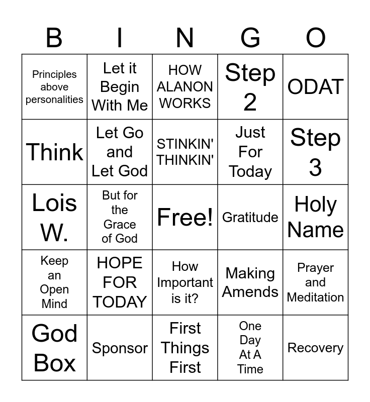 This bingo card has a free space and 34 words: Live and Let Live, Easy Does It, Keep it Simple, Butterfly, Holy Name, Think, Let Go and Let God, First Things First, Just For Today, Recovery, Lois W., Let it Begin With Me, One Day At A Time, Courage to Change, Keep an Open Mind, But for the Grace of God, How Important is it?, Gratitude, Prayer and Meditation, God Box, Sponsor, Step 1, Step 2, Step 3, C A L, HOPE FOR TODAY, HOW ALANON WORKS, THOUGHT FOR THE DAY, ODAT, Principles above personalities, SLOGANS, STINKIN' THINKIN', Making Amends and Be where your feet are.