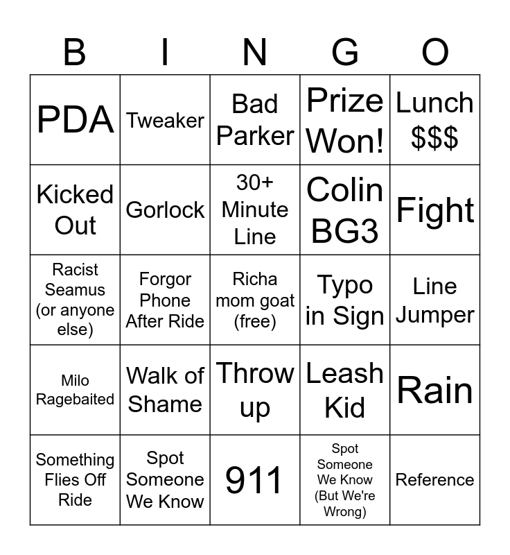 This bingo card has a free space and 39 words: Leon Late, Seamus Hounds Leon, Baddie, Gorlock, Something Flies Off Ride, Throw up, 30+ Minute Line, No Line, Lunch $$$, Milo Ragebaited, Forgor Phone After Ride, Prize Won!, Reference, Line Jumper, Typo in Sign, Walk of Shame, Bootleg Prizes, PDA, Ride Broke While in Line, Leash Kid, Kicked Out, 911, Colin BG3, Fight, Leon wakes up late, Seamus stops for food, Crying kid stops with candy, Karen Arguing, Hate Crime, Tweaker, Blasting Music, Car Crash, Bad Parker, Spot Someone We Know, Spot Someone We Know (But We're Wrong), Generational Aura Loss, Rain, Racist Seamus (or anyone else) and Generational Crash Out.