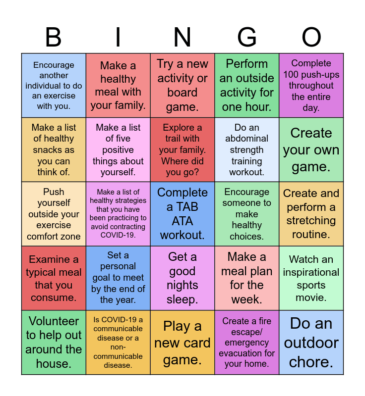 This bingo card has 25 words: Set a personal goal to meet by the end of the year., Play a new card game., Explore a trail with your family. Where did you go?, Volunteer to help out around the house., Complete 100 push-ups throughout the entire day., Encourage another individual to do an exercise with you., Make a list of healthy snacks as you can think of., Make a healthy meal with your family., Encourage someone to make healthy choices., Get a good nights sleep., Do an abdominal strength training workout., Push yourself outside your exercise comfort zone, Make a meal plan for the week., Watch an inspirational sports movie., Make a list of five positive things about yourself., Do an outdoor chore., Create and perform a stretching routine., Try a new activity or board game., Create your own game., Make a list of healthy strategies that you have been practicing to avoid contracting COVID-19., Complete a TABATA workout., Is COVID-19 a communicable disease or a non-communicable disease., Examine a typical meal that you consume., Perform an outside activity for one hour. and Create a fire escape/ emergency evacuation for your home..