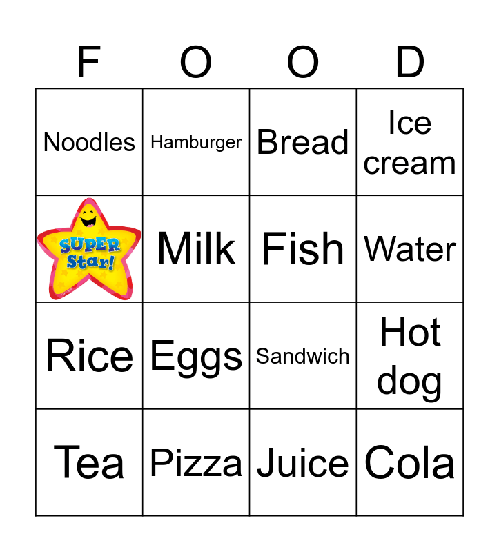 This bingo card has 1 images and 15 words: Pizza, Hot dog, Bread, Noodles, Rice, Hamburger, Sandwich, Juice, Milk, Tea, Ice cream, Eggs, Water, Fish and Cola.