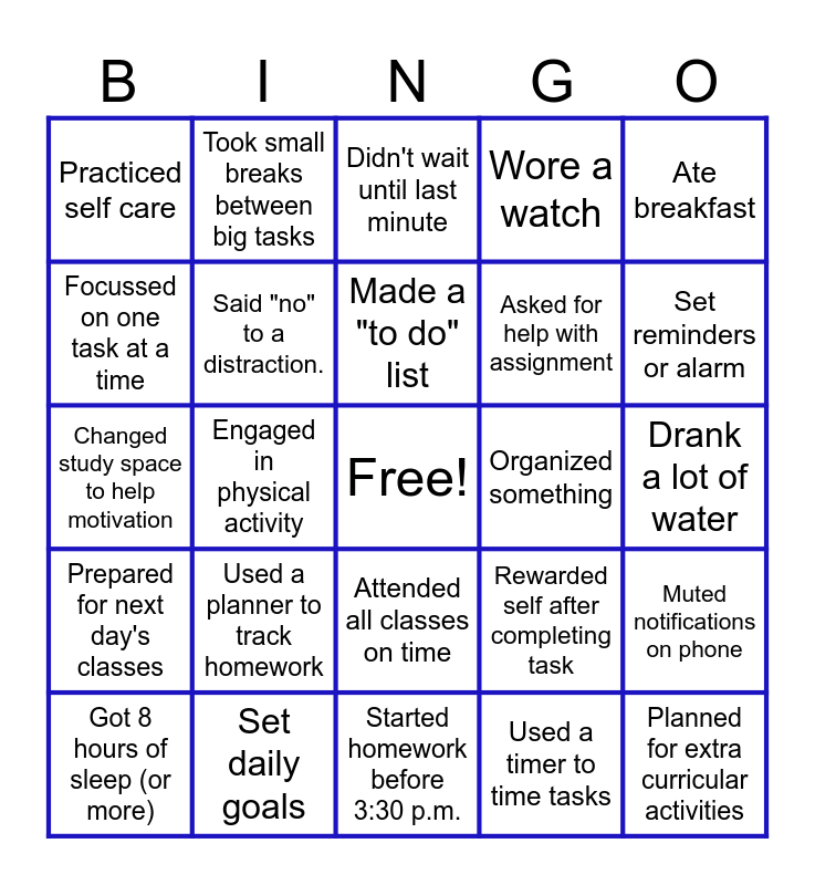 This bingo card has a free space and 24 words: Got 8 hours of sleep (or more), Used a planner to track homework, Made a "to do" list, Used a timer to time tasks, Ate breakfast, Practiced self care, Took small breaks between big tasks, Didn't wait until last minute, Organized something, Drank a lot of water, Changed study space to help motivation, Said "no" to a distraction., Rewarded self after completing task, Muted notifications on phone, Focussed on one task at a time, Set daily goals, Started homework before 3:30 p.m., Wore a watch, Set reminders or alarm, Prepared for next day's classes, Engaged in physical activity, Attended all classes on time, Asked for help with assignment and Planned for extra curricular activities.