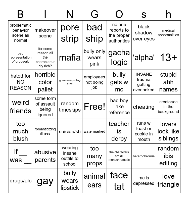 This bingo card has a free space and 48 words: the characters are all monochramatic, 'alpha', animal ears, some form of assault being ignored, grammar/spelling error, creator/oc in the background, makeover scene, gay, black shadow over eyes, watermarked, medical abnormalities, bad ship, INSANE trauma getting overlooked, bully gets w mc, if __ was __, cheating, bad representation of drugs/alc, 13+, heterochromia, no one reports to the proper authorities, gacha logic, random timeskips, problematic behavior scene as normal, for some reason all the characters r rlly rich?, random ibis editing, mafia, stupid ahh names, drugs/alc, employees not doing job, horrible color pallet, mc is depressed, bad boy jake reference, lovers look like siblings, abusive parents, weird friends, teacher is derpy, runs w toast or cookie in mouth, hated for NO REASON, suicide/sh, wearing insane outfits to school, too much blush, love triangle, pore strip, bully wears lipstick, bully only wears pink, too many props, romanticizing illness and face tat.