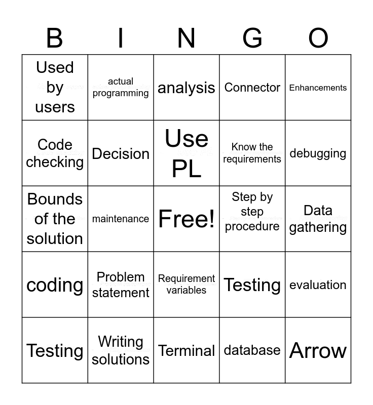 This bingo card has 20 images, a free space and 24 words: Problem statement, Writing solutions, Use PL, Testing, Enhancements, Used by users, Code checking, actual programming, Step by step procedure, Requirement variables, Know the requirements, Bounds of the solution, Testing, evaluation, Decision, database, Data gathering, analysis, debugging, maintenance, Arrow, coding, Connector and Terminal.