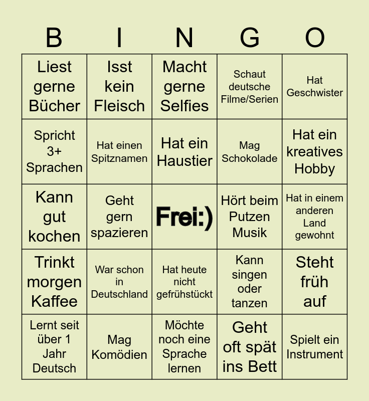 This bingo card has a free space and 24 words: War schon in Deutschland, Mag Komödien, Hat ein Haustier, Lernt seit über 1 Jahr Deutsch, Hat Geschwister, Liest gerne Bücher, Spricht 3+ Sprachen, Isst kein Fleisch, Hört beim Putzen Musik, Hat heute nicht gefrühstückt, Mag Schokolade, Kann gut kochen, Kann singen oder tanzen, Steht früh auf, Hat einen Spitznamen, Geht oft spät ins Bett, Hat in einem anderen Land gewohnt, Macht gerne Selfies, Hat ein kreatives Hobby, Geht gern spazieren, Spielt ein Instrument, Trinkt morgen Kaffee, Schaut deutsche Filme/Serien and Möchte noch eine Sprache lernen.