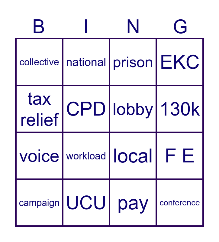 This bingo card has 16 words: UCU, F E, prison, collective, voice, national, local, pay, tax relief, CPD, campaign, EKC, workload, 130k, lobby and conference.