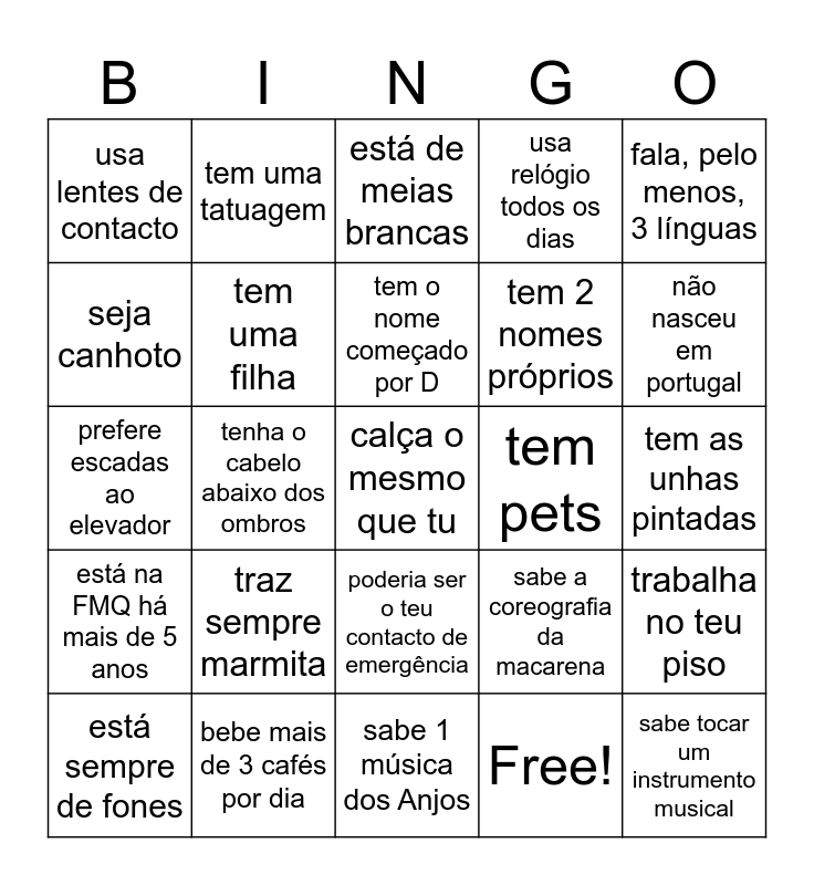This bingo card has 32 words: Free!, use óculos, tenha o cabelo abaixo dos ombros, entrou na FMQ este ano, está na FMQ há mais de 5 anos, tem uma filha, fala, pelo menos, 3 línguas, trabalha no teu piso, tem uma tatuagem, sabe tocar um instrumento musical, tem o nome começado por D, está de meias brancas, é do mesmo signo que tu, tem a melhor coleção de stickers, tem pets, espirra muito alto, está sempre de fones, prefere escadas ao elevador, poderia ser o teu contacto de emergência, traz sempre marmita, sabe a coreografia da macarena, sabe fazer a roda, tem as unhas pintadas, bebe mais de 3 cafés por dia, calça o mesmo que tu, usa relógio todos os dias, tem 2 nomes próprios, seja canhoto, usa lentes de contacto, sabe 1 música dos Anjos, tem um irmão mais novo and não nasceu em portugal.