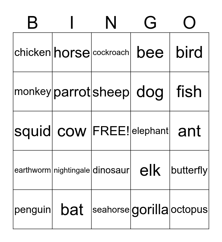 This bingo card has a free space and 70 words: alpaca, ant, antelope, badger, bat, bear, bee, beetle, bird, bison, butterfly, cat, chicken, cockroach, coral, cow, dinosaur, dog, dolphin, earthworm, elephant, elk, fish, fly, fox, frog, giraffe, goat, gorilla, hippopotamus, horse, human, iguana, jellyfish, kangaroo, lion, lizard, llama, lynx, monkey, mouse, nightingale, octopus, owl, ox, parrot, penguin, pig, quail, rabbit, rat, rhinoceros, salamander, scorpion, seahorse, shark, sheep, sloth, snake, spider, squid, starfish, tiger, turtle, urial, vole, whale, wolf, yak and zebra.