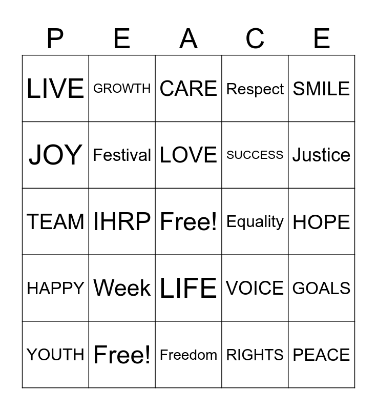 This bingo card has 28 words: GOALS, DIGNITY, SUCCESS, RIGHTS, JOY, CARE, GROWTH, HAPPY, Equality, YOUTH, TEAM, Respect, Free!, Freedom, Justice, Asylum, Week, Festival, LOVE, LIFE, LIVE, PEACE, Free!, IHRP, HOPE, VOICE, SMILE and FREE!.