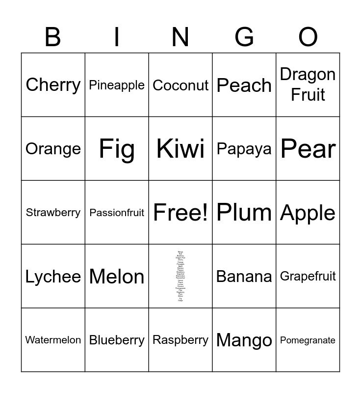 This bingo card has a free space and 26 words: Mango Kiwi Blueberry Dragon Fruit Cherry Orange Pineapple Apple Banana Papaya Strawberry Grapefruit Watermelon Passionfruit Lemon Peach Lychee Coconut Pomegranate Pear Raspberry Plum Melon Fig Grape, Mango, Kiwi, Blueberry, Dragon Fruit, Cherry, Orange, Pineapple, Apple, Banana, Papaya, Strawberry, Grapefruit, Watermelon, Passionfruit, Lemon, Peach, Lychee, Coconut, Pomegranate, Pear, Raspberry, Plum, Melon, Fig and Grape.
