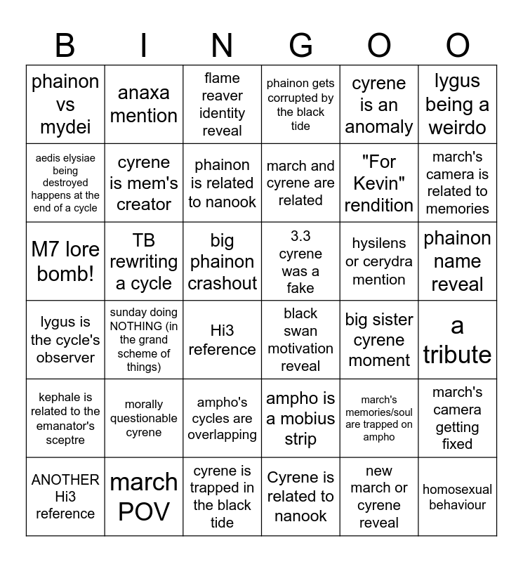 This bingo card has 36 words: ampho is a mobius strip, ampho's cycles are overlapping, Cyrene is related to nanook, aedis elysiae being destroyed happens at the end of a cycle, lygus is the cycle's observer, 3.3 cyrene was a fake, cyrene is mem's creator, cyrene is trapped in the black tide, cyrene is an anomaly, march's memories/soul are trapped on ampho, march's camera is related to memories, phainon gets corrupted by the black tide, march's camera getting fixed, TB rewriting a cycle, march and cyrene are related, phainon vs mydei, kephale is related to the emanator's sceptre, hysilens or cerydra mention, M7 lore bomb!, flame reaver identity reveal, big phainon crashout, sunday doing NOTHING (in the grand scheme of things), black swan motivation reveal, Hi3 reference, big sister cyrene moment, anaxa mention, "For Kevin" rendition, march POV, phainon is related to nanook, lygus being a weirdo, homosexual behaviour, ANOTHER Hi3 reference, a tribute, phainon name reveal, morally questionable cyrene and new march or cyrene reveal.
