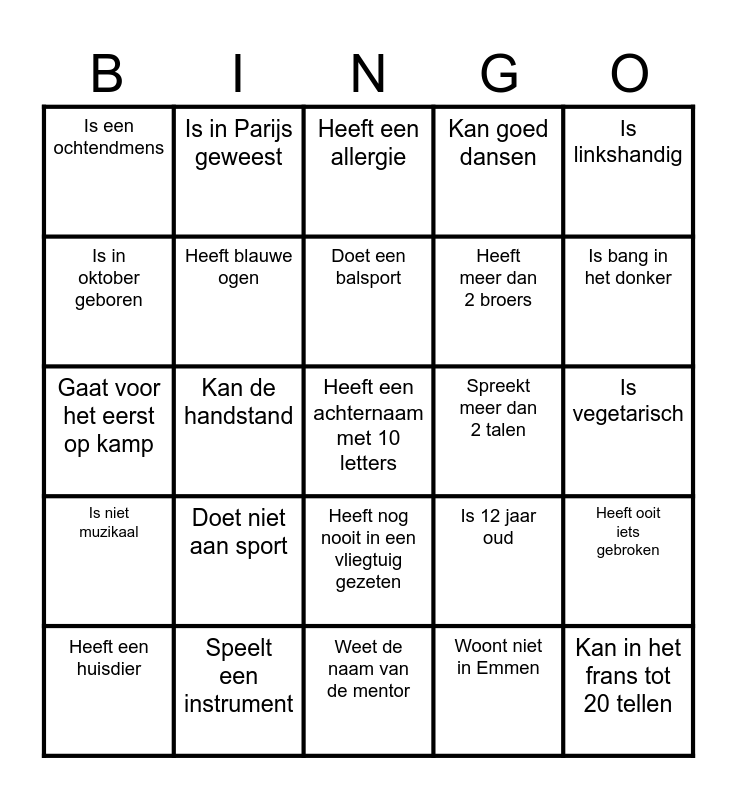 This bingo card has a free space and 24 words: Doet niet aan sport, Speelt een instrument, Doet een balsport, Heeft een huisdier, Is linkshandig, Is een ochtendmens, Is in oktober geboren, Is in Parijs geweest, Spreekt meer dan 2 talen, Heeft nog nooit in een vliegtuig gezeten, Heeft meer dan 2 broers, Gaat voor het eerst op kamp, Is 12 jaar oud, Heeft ooit iets gebroken, Heeft blauwe ogen, Woont niet in Emmen, Is vegetarisch, Heeft een allergie, Is bang in het donker, Kan de handstand, Kan in het frans tot 20 tellen, Is niet muzikaal, Kan goed dansen and Weet de naam van de mentor.