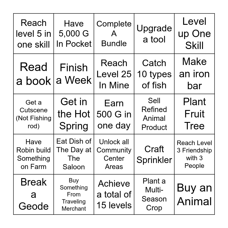 This bingo card has 32 words: Plant a Multi-Season Crop, Buy Something from Hat Mouse, Get in the Hot Spring, Complete a Task on Bulletin Board, Have Robin build Something on Farm, Finish a Week, Level up One Skill, Reach Level 3 Friendship with 3 People, Have 5,000 G In Pocket, Buy an Animal, Reach Level 25 In Mine, Complete A Bundle, Sell 10 Cauliflowers, Buy Backpack, Sell Refined Animal Product, Donate 10 Items To Museum, Break a Geode, Get a Cutscene (Not Fishing rod), Unlock all Community Center Areas, Eat Dish of The Day at The Saloon, Craft Sprinkler, Give Water To Pet, Plant Fruit Tree, Buy Something From Traveling Merchant, Earn 500 G in one day, Upgrade a tool, Catch 10 types of fish, Read a book, Reach level 5 in one skill, Achieve a total of 15 levels, Catch something in a crabpot and Make an iron bar.