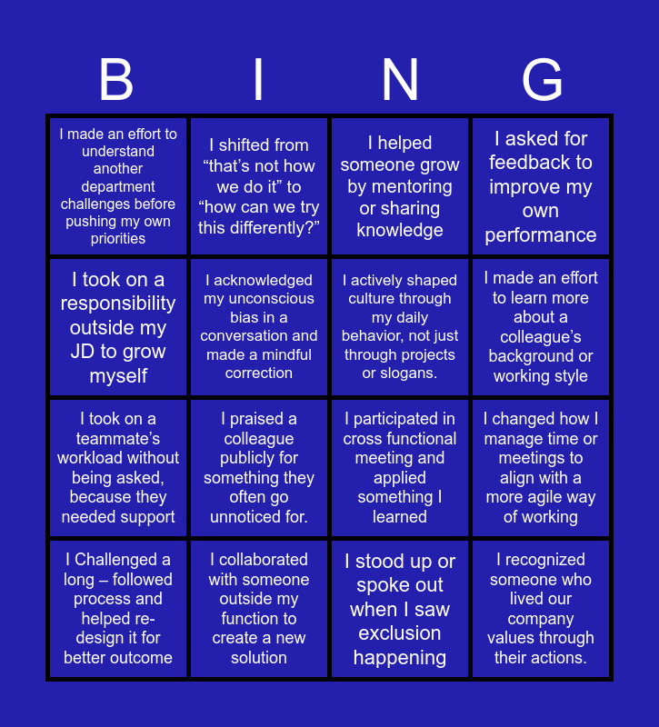 This bingo card has 16 words: I Challenged a long – followed process and helped re-design it for better outcome, I collaborated with someone outside my function to create a new solution, I helped someone grow by mentoring or sharing knowledge, I asked for feedback to improve my own performance, I took on a responsibility outside my JD to grow myself, I shifted from “that’s not how we do it” to “how can we try this differently?”, I participated in cross functional meeting and applied something I learned, I changed how I manage time or meetings to align with a more agile way of working, I made an effort to understand another department challenges before pushing my own priorities, I acknowledged my unconscious bias in a conversation and made a mindful correction, I stood up or spoke out when I saw exclusion happening, I made an effort to learn more about a colleague’s background or working style, I took on a teammate’s workload without being asked, because they needed support, I praised a colleague publicly for something they often go unnoticed for., I actively shaped culture through my daily behavior, not just through projects or slogans. and I recognized someone who lived our company values through their actions..