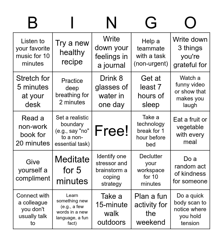 This bingo card has a free space and 25 words: Meditate for 5 minutes, Take a 15-minute walk outdoors, Drink 8 glasses of water in one day, Connect with a colleague you don't usually talk to, Write down 3 things you're grateful for, Listen to your favorite music for 10 minutes, Stretch for 5 minutes at your desk, Try a new healthy recipe, Take a technology break for 1 hour before bed, Identify one stressor and brainstorm a coping strategy, Get at least 7 hours of sleep, Read a non-work book for 20 minutes, Declutter your workspace for 10 minutes, Do a random act of kindness for someone, Practice deep breathing for 2 minutes, Spend 15 minutes on a hobby you enjoy, Eat a fruit or vegetable with every meal, Write down your feelings in a journal, Watch a funny video or show that makes you laugh, Set a realistic boundary (e.g., say "no" to a non-essential task), Do a quick body scan to notice where you hold tension, Learn something new (e.g., a few words in a new language, a fun fact), Give yourself a compliment, Help a teammate with a task (non-urgent) and Plan a fun activity for the weekend.