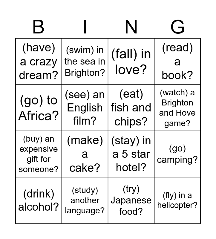 This bingo card has 16 words: (study) another language?, (go) camping?, (fall) in love?, (have) a crazy dream?, (buy) an expensive gift for someone?, (swim) in the sea in Brighton?, (stay) in a 5 star hotel?, (try) Japanese food?, (go) to Africa?, (see) an English film?, (drink) alcohol?, (read) a book?, (make) a cake?, (watch) a Brighton and Hove game?, (eat) fish and chips? and (fly) in a helicopter?.