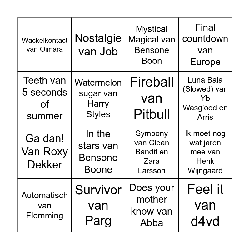 This bingo card has 37 words: Lotje van Lustrum, Ordinary van Alex Warren, Industry plant van Roxy Dekker, Fireball van Pitbull, Vakantie van Anne Fleur, Het vliegerlied van Café The Block, Luna Bala (Slowed) van Yb Wasg’ood en Arris, Blue (Da Ba Dee) van Eiffel 65, Teeth van 5 seconds of summer, Tokyo Drift (Trap Bass) van Tra Woofer, Ik moet nog wat jaren mee van Henk Wijngaard, Final countdown van Europe, Automatisch van Flemming, Does your mother know van Abba, Watermelon sugar van Harry Styles, Feel it van d4vd, Hard times van Paramore, Mystical Magical van Bensone Boon, Jouw idee van Roxy Dekker, Survivor van Parg, Wackelkontact van Oimara, In the stars van Bensone Boone, Ladada van Claude, Sweet Caroline van DJ Ötzi, De kleuren van FCG van Dennis Franke, Samen naar de Euroborg van TikTok Tammo, Nostalgie van Job, Europapa van Joost Klein, Als het avond is van Suzan en Freek, C’est La Via van Claude, Espresso Macchiato van Tommy Cash, The Glen van Levi Heron, Sympony van Clean Bandit en Zara Larsson, Diamonds van Rihanna, Gaan wij weg? van Roxy Dekker, Ga dan! Van Roxy Dekker and Stargazing van Myles Smith.