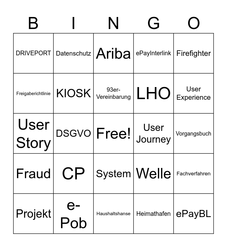 This bingo card has a free space and 56 words: KI, Projekt, Scrum, DRIVEPORT, Haushaltshanse, Prozessschärfe, KIOSK, Cloud, LHO, Frozen Zone, ePayInterlink, ePayment, 142-Felder-Liste, Home-Office, EfA, Currywurst, Firefighter, DSGVO, Patch, ePayBL, User Journey, SAP HANA, Welle, Ariba, Daily, 93er-Vereinbarung, Funktionspostfach, PayPal, User Experience, LSP, 4-Augen-Prinzip, SAP-BIS, Bug, LSBG, Vorgangsbuch, Freigaberichtlinie, User Story, RVP, Fraud, Datenschutz, System, Paper2Byte, DRIVE, Entwicklungsaufwand, Das nehmen wir mit., CP, e-Pob, Berechtigung, End-2-End, Agil, Heimathafen, DevOPs, PEV, SAP, Fachverfahren and INES.