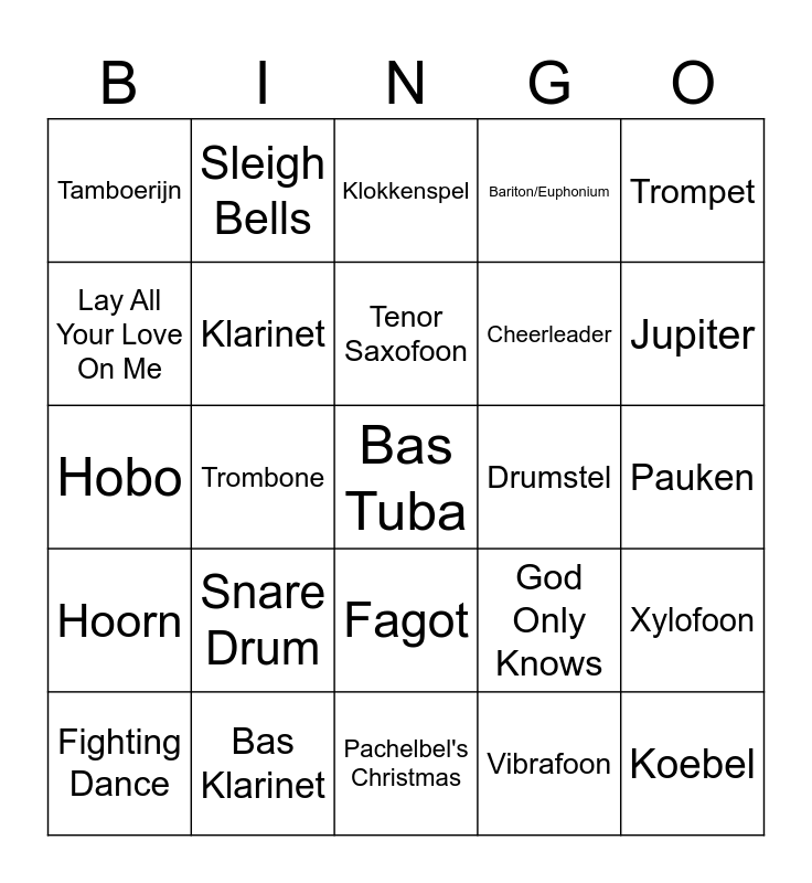 This bingo card has 40 words: Fluit, Hobo, Alt Saxofoon, Klarinet, Bas Klarinet, Fagot, Tenor Saxofoon, Bariton Saxofoon, Trompet, Hoorn, Trombone, Bariton/Euphonium, Bas Tuba, Pauken, Drumstel, Snare Drum, Bas Drum, Tamboerijn, Triangel, Klokkenspel, Xylofoon, Vibrafoon, Cheerleader, Lay All Your Love On Me, Thank You For The Music, Fernando, I Have a Dream, Sopraan Saxofoon, Koebel, Windchimes, Samba, Fighting Dance, Disco, God Only Knows, Jupiter, Pachelbel's Christmas, A Celtic Christmas, Sleigh Ride, Sleigh Bells and A Christmas Festival.
