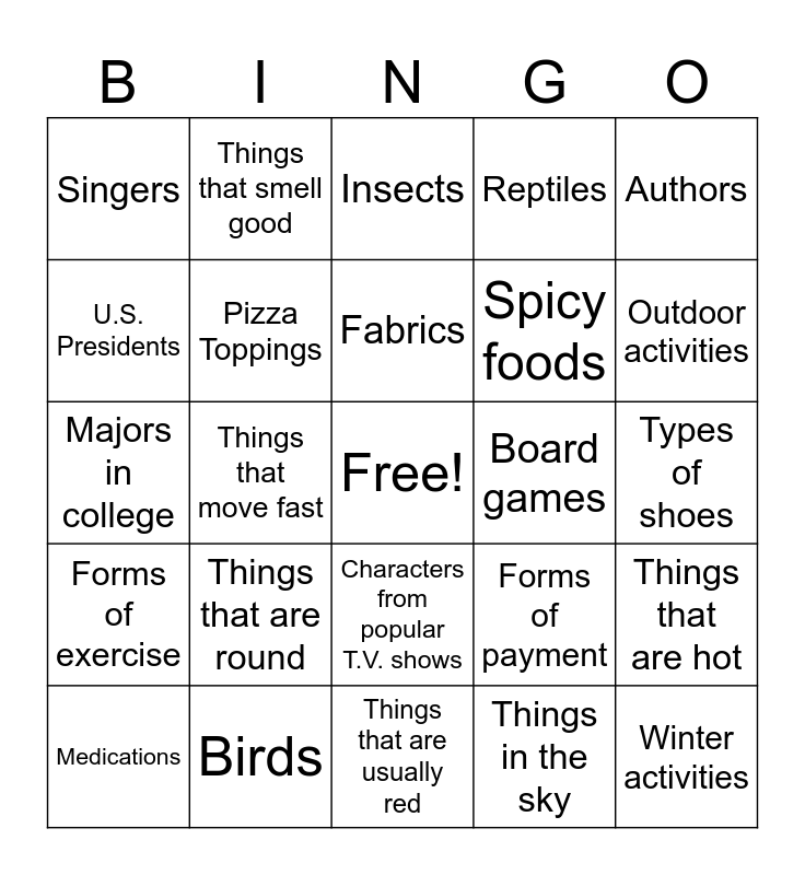 This bingo card has a free space and 24 words: Things that are round, Birds, Fabrics, Medications, Authors, Singers, U.S. Presidents, Things that smell good, Board games, Characters from popular T.V. shows, Spicy foods, Majors in college, Forms of payment, Things that are hot, Pizza Toppings, Things in the sky, Types of shoes, Insects, Outdoor activities, Things that move fast, Winter activities, Forms of exercise, Reptiles and Things that are usually red.