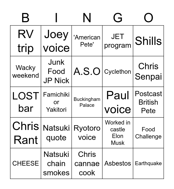 This bingo card has a free space and 24 words: Natsuki quote, Natsuki chain smokes, A.S.O, CHEESE, Shills, RV trip, Wacky weekend, Joey voice, Paul voice, Ryotoro voice, Cyclethon, LOST bar, Worked in castle Elon Musk, Food Challenge, Junk Food JP Nick, Asbestos, Postcast British Pete, 'American Pete', Chris Senpai, Famichiki or Yakitori, Earthquake, Chris Rant, JET program and Chris cannae cook.