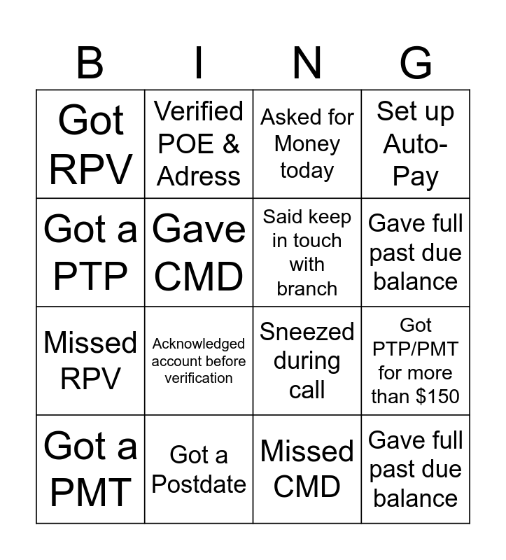 This bingo card has 17 words: Missed CMD, Got a PMT, Asked for Money today, Got RPV, Acknowledged account before verification, Set up Auto-Pay, Got PTP/PMT for more than $150, Said keep in touch with branch, Gave full past due balance, Gave CMD, Got a Postdate, Sneezed during call, Got a PTP, Verified POE & Adress, Missed RPV, Missed Keep in-touch with the Branch and Gave full past due balance.